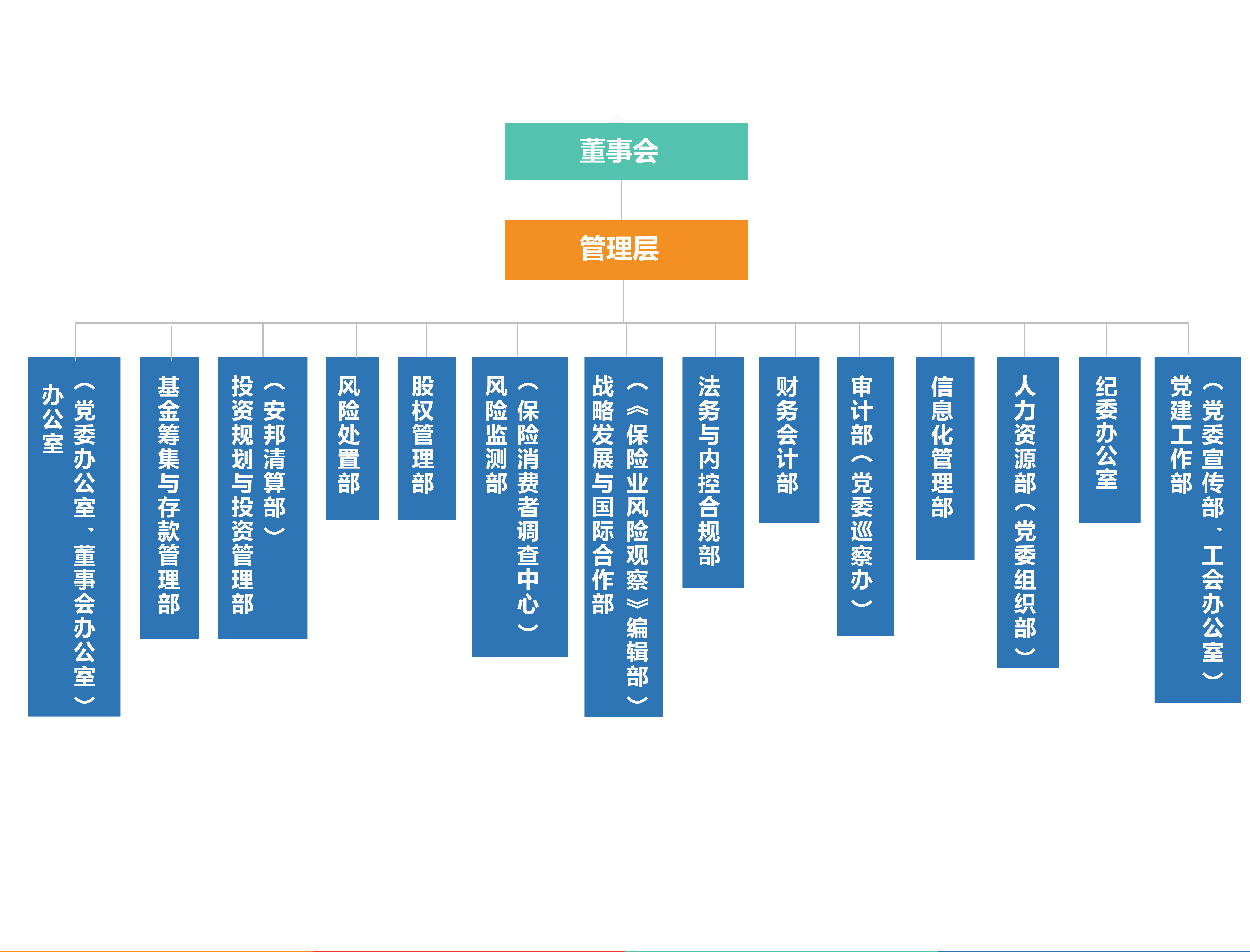 目前公司内部机构设置包括办公室(党委办公室、董事会办公室)、基金筹集与存款管理部、投资规划与投资管理部(安邦清算部)、风险处置部、股权管理部、风险监测部(保险消费者调查中心)、战略发展与国际合作部(《保险业风险观察》编辑部)、法务与内控合规部、财务会计部、审计部(党委巡察办)、信息化管理部、人力资源部(党委组织部)、纪委办公室、党建工作部(党委宣传部、工会办公室)共十四个部门。